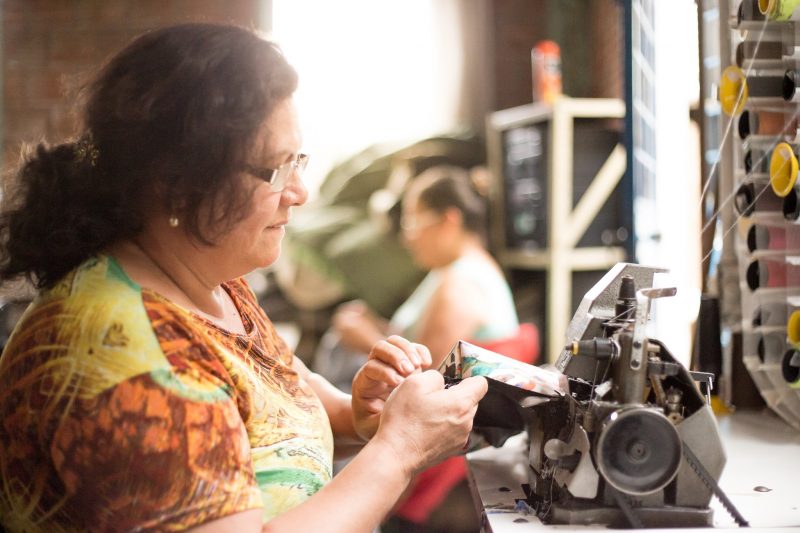 Alice Meditsch, de 26 anos, e Gabriela Ruiz Gonçalves, de 31, estão à frente da Colibrii, mas não querem levar todo o crédito pela criação das mochilas, carteiras, ecobags e outros produtos destinados a guardar coisas. Desde que começou a ser montada, entre o fim de 2013 e o início de 2014 por Gabriela e sua sócia na época, Marília Martins, a ideia da Colibrii é desenvolver os acessórios – desde o design até a confecção – junto com as próprias artesãs. “A gente conversou com elas e falou que não era só a gente ir ali com uma ideia já pronta e pedir pra elas fazerem. A gente via a importância de abrir o espaço para que existisse uma troca”, explica Gabriela.