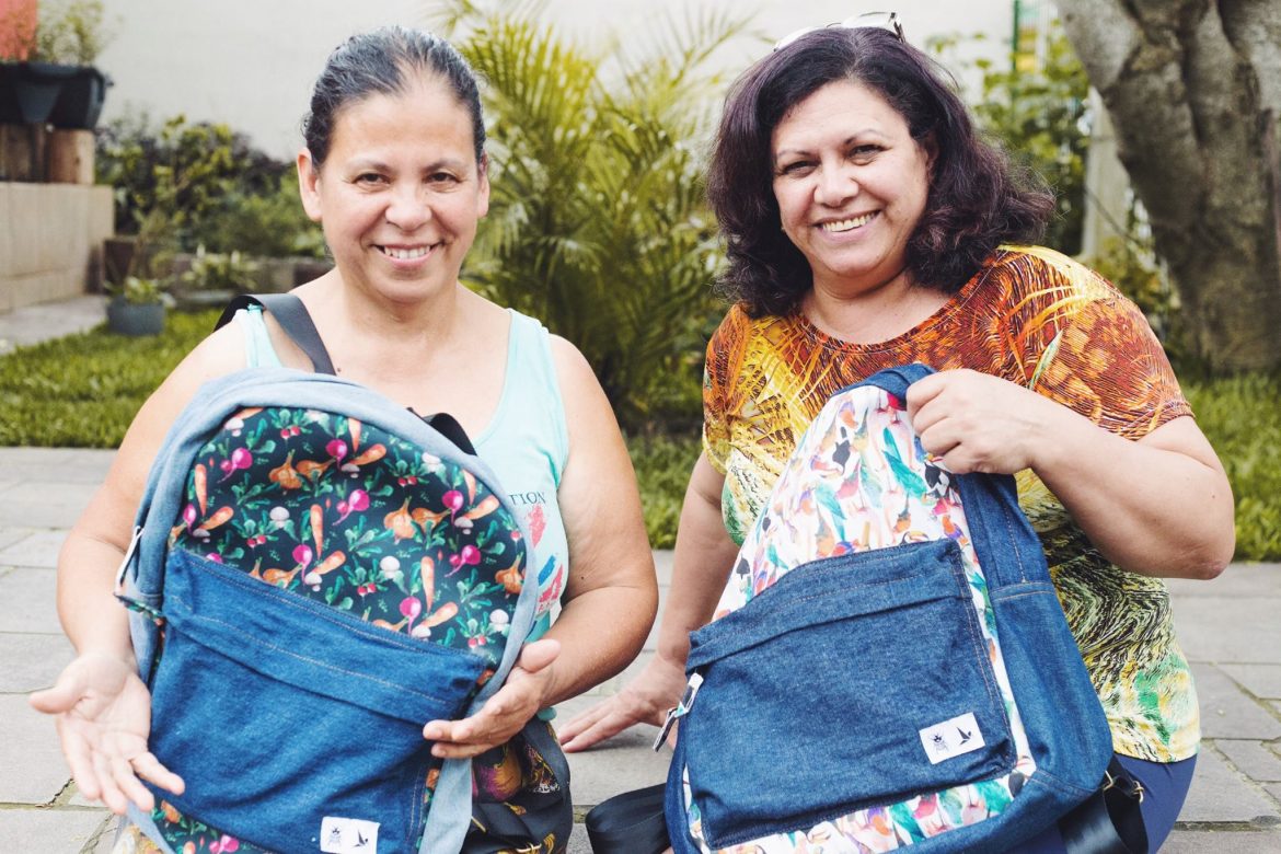 Foi graças a essa troca de conhecimentos com essas criativas senhoras que surgiu a ideia de ressignificar materiais nas confecções. “A Eni já trabalhava há muito tempo com jeans e reaproveitamento, daí a gente fez um teste. Teve uma aceitação super boa e então desenvolvemos essa proposta”, conta Gabriela. Já o forro das mochilas e das ecobags é feito com guarda-chuvas. Dona Natalia, moradora do bairro Partenon, já tinha experiência com esse material e sugeriu sua incorporação.
