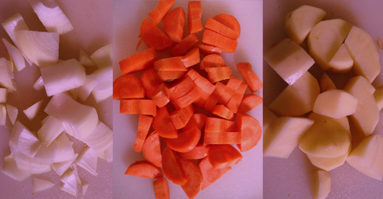- A primeira coisa que você vai precisar é: cortar rusticamente uma cebola grande, duas cenouras médias e 3 batatas médias. Vou dar as medidas que fiz aqui em casa para mim e meu compa, mas vai sobrar. Daria numa boa pra 4 pessoas. Ou 3 pessoas com fome. ENFIM.