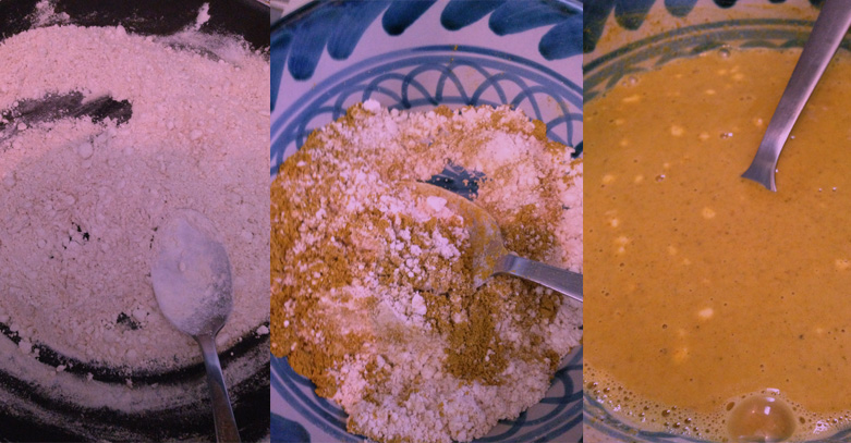 - Caso você tenha acesso a uma lojinha japonesa, você já pode comprar aqueles tabletes de karê prontos. Mas vou dar a dica pra maioria que, como eu, que não tem acesso a essas lojas. Você pega farinha comum, de trigo, e coloca ela na frigideira pra torrar um pouco. Isso faz tirar o gosto de farinha quando é usada pra engrossar caldos (JÁ FIKDIK).Depois, você mistura essa farinha (eu coloquei muito, mas pode ser de 4 a 5 colheres de sopa) com 3 a 4 colheres de curry em pó. Por fim, coloca um pouco de água gelada e faz uma mistura homogênea até não empelotar mais. A água gelada ajuda a não empelotar (muito).