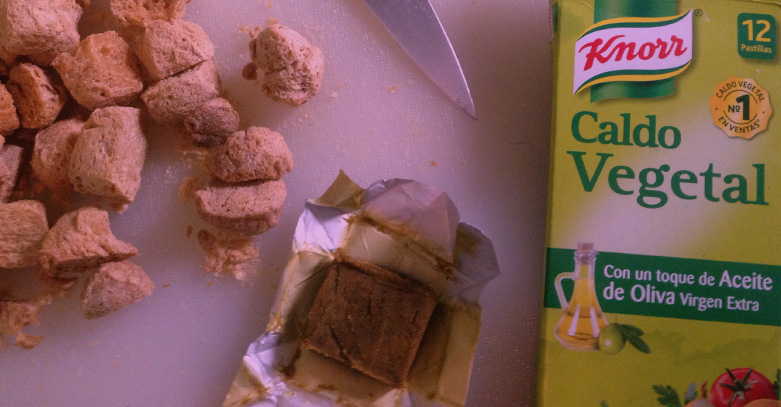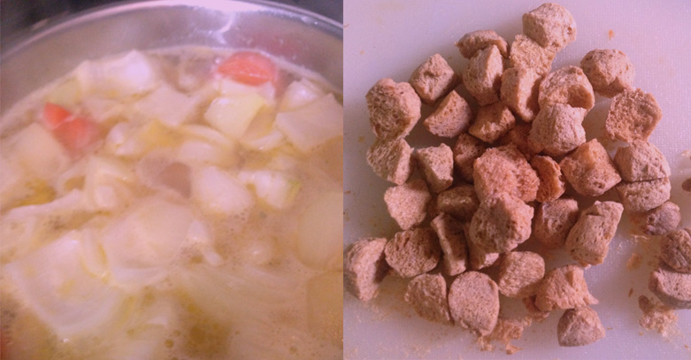 - Coloque um fio de óleo (da sua preferência) em uma panela e coloque primeiro a cenoura pra dar uma selada. Depois coloque a batata, e por fim a cebola, misture um pouco e coloque água até a metade da panela. Talvez uns 500ml de água, não sei dizer a quantidade porque faço por olho, pior pessoa pra passar receita, haha. Pode deixar que vou me atentar na próxima vez, MAS TENHO FOTOS.Coloquei muita água, pode por um pouco menos ou deixe a água evaporar um pouco antes do próximo passo. Se você quiser por soja, não precisa hidratá-la, pode colocar nesse momento do cozimento dos legumes que ela vai hidratar junto. Nesse momento, é legal também colocar um tablete de caldo de legumes (já é mais acessível pra todo mundo).Você também pode hidratar a sua soja antes e deixar ela marinando em shoyo com um pouco de suco de limão (limão espremido) pra ela pegar uma cor e um gosto. Não fiz, mas fica bom pra receitas de estrogonofe também, hahaha.